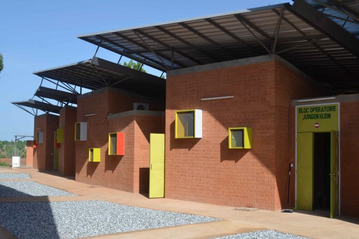 Implantée au centre-ville de Léo sur un domaine ombragé, la clinique a été réalisée par l’architecte Francis Kéré sur un style écologique, offrant un micro climat agréable pour le séjour des patients.